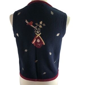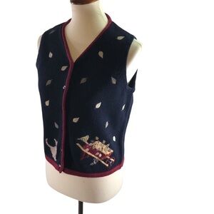 Vintage Y2K Ramie Cotton Embroidered Knit Vest Sz S Navy Wine Cat Bird Novelty