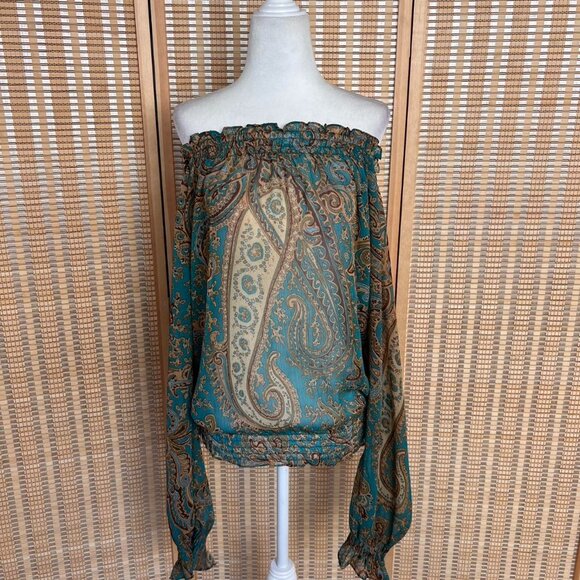 Vintage Y2K Rave boho turquoise and tan paisley print long sleeve blouse that can be worn multiple ways! Very lightweight and sheer. No noticeable flaws.