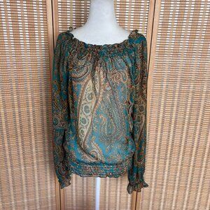 Vintage Y2K Rave boho turquoise and tan paisley print long sleeve blouse