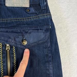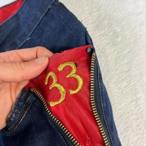 Unique pockets that unzip to reveal red interiors embroidered RA on one side and the number 33 on the other in gold metallic thread. Loads of unique details. RA logo with crown buttons and rivets, metallic gold thread detail stitching. Contrasting red interior waistband.