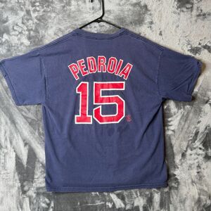 The product is a vintage Y2K Red Sox short sleeve navy number 15 Pedroia promo t-shirt, featuring a solid blue color with a crew neck and made of cotton material. This shirt has a regular fit and is machine washable, making it suitable for summer and spring seasons. It is a collectible item from the year 2000-2009 with the Red Sox brand, perfect for fans of the team or vintage clothing enthusiasts.