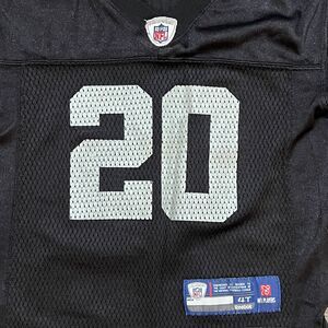 Elevate your kid’s game-day look with this vintage Reebok NFL Equipment Darren McFadden #20 Oakland Raiders youth jersey in size 4T. This authentic 2000s style was produced during the era when Reebok held the NFL uniform contract. The jersey features the classic NFL Equipment shield, Reebok vector logos on the sleeves, and a breathable mesh body with screen-printed numbers and nameplate. Black and silver team colors deliver the iconic Raiders look. The jersey is in good pre-owned condition with normal signs of wear appropriate for age, including minor fabric or print wear (see photos). No major flaws. Perfect for young fans, collectors, or anyone wanting a retro Raiders piece.