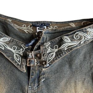 Features iconic Y2K mall-brand detailing embroidered floral scrolls at the waistband and hems, a unique double buckle front, and sandblasted faded denim.