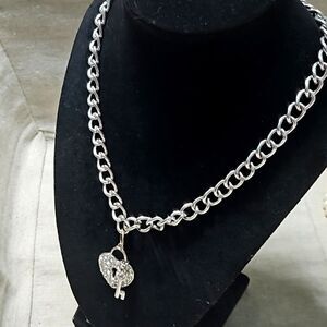 Vintage Y2K Rhinestone Heart Lock Key Silver Tone Bling Necklace