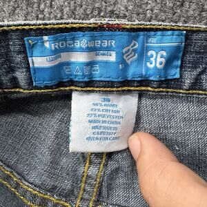 The product is a pair of vintage Y2K Rocket Men's Embroidered Baggy Denim Jeans by Rocawear, featuring a wide-leg style with a hip hop theme. These jeans are a classic addition for any urban fashion enthusiast, with a regular fit and a size 36 waist. The deep blue denim fabric is accented with embroidered details, giving off a nostalgic and unique vibe perfect for those looking to make a statement with their attire.