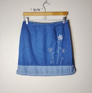 Y2K mini skirt, vintage denim skirt, Route 66 skirt, embroidered denim, floral mini skirt, retro 2000s style, contrast hem skirt, juniors 9/10 skirt, grunge revival, nostalgic Y2K, retro denim mini, low rise style, vintage embroidered skirt Y2K fashion, Y2K mini skirt, vintage 2000s, retro denim, low rise style, baby tee outfit, early 2000s vibe