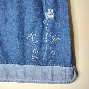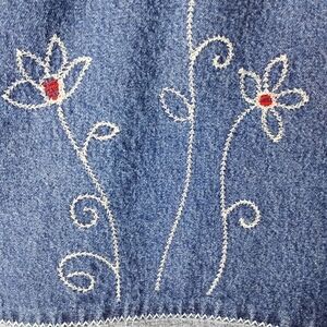 Throwback Y2K denim mini from Route 66 — a true early-2000s classic. Features floral embroidery with red and white accents, side slits, and a contrast hem. Made from 100% cotton denim (no stretch) with a back zip closure.