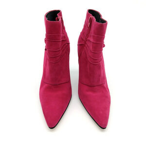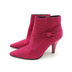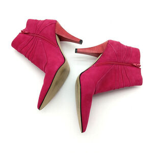 Vintage Y2K Sam & Libby hot pink suede pointed toe ankle boots, size 6.5. They are gently pre-owned, show light marks on heels from a sticker, see photos. May show light wear or scuffs from normal use.