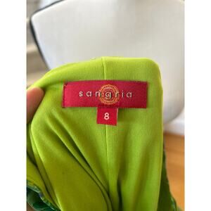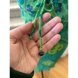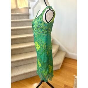 Very good condition, one dangle is missing its metal embellishment. Tone on tone emerald and lime green with patchwork floral block print. Sleeveless, scoop neck, with tie over the bust. Midi length.