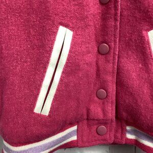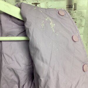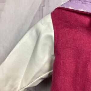 Reversible with a hood that zips up. Quilted lining, pockets on each side. Pink with purple on the inside or other side. Faux leather sleeves. Snap up front. There is some slight peeling on the shoulder inside as well as the neckline. Features the character Zoe on it with a soccer (football) with embroidered patches on the front, sleeve and large one on the back.
