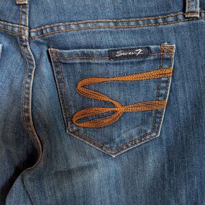 Vintage 2000s (Y2K) Seven7 low rise jeans. Flare. Dark wash denim. Zip fly. Embroidered back pockets. Jeans are in good vintage condition with light wear.