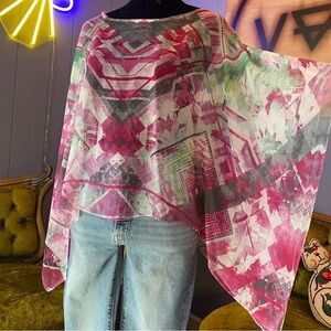 Step into the early 2000s with this vibrant vintage Y2K top featuring a bold geometric and abstract print in shades of magenta, fuchsia, forest green, and soft gray. The lightweight sheer fabric drapes effortlessly with a relaxed poncho-style silhouette and asymmetrical hem, making it a standout layering piece. Perfect for festivals, casual days, or adding a splash of retro flair to your look. Pair it with denim for an easygoing, throwback vibe.