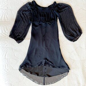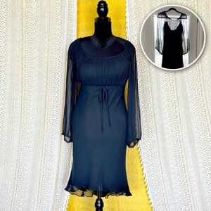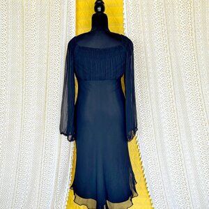 Vintage Y2K Sheer Black Milkmaid Mermaid Midi Dress Size 6 - Whimsigoth How FUN is this incredible little black dress?! I can see a teenage Morticia Addams rocking this—definitely has that VA VA VOOM vibe that she has mastered! Milkmaid style gathering on the chest in sheer black chiffon, as well as sheer black balloon sleeves and the sheer chiffon excitement continues all the way to the bottom hem of the dress with a flowy fishtail layer over the lining. In excellent pre-owned condition with no flaws. All garments come from a smoke-free home and are either laundered or steam cleaned. Any flaws or damage will be photographed and noted in the description of my listings. Thanks for looking and please reach out with any questions or offers! Tags: Dark Coquette, Darkcoquetteaesthetic, Gloomycoquette, Goth, Grunge, Whimsigoth, Whimsygoth, Chiffon, Sheer, Wednesday, Addams Family, Morticia, Fairy, Dark Fairy, Fairycore, Ethereal, Fairygrunge, Darkfeminine, fairycoreclothing, Fae, Twilight, Gothic, Gothicromance, Romantic, Romance, Darkacademia