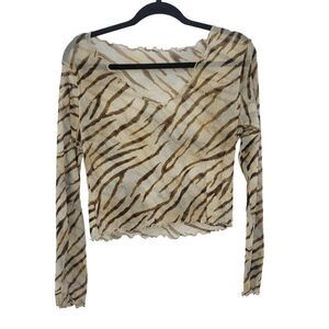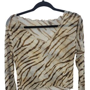 Vintage Y2K Sheer Zebra Print Long Sleeve Top M Brown Stretch Tattoo Baddie Club
