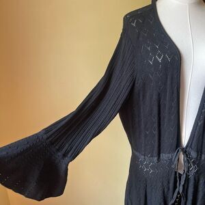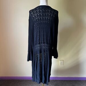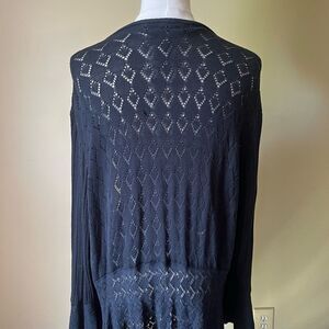 vintage y2k cardigan duster, black pointelle knit, silk blend cardigan, plus size boho cardigan, gothic fairycore cardigan, witchy bell sleeve sweater, romantic dark academia knit, long open front cardigan, victorian inspired knitwear, ethereal cottagecore cardigan, fall layering piece, nine west woman cardigan 3x, 2000s witchy fashion, elegant gothic clothing, femme fatale aesthetic