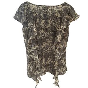 Excellent condition. Tan and brown ditzy floral print. Cap flutter sleeve with cascading ruffles down the front and back.