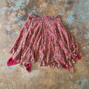 Vintage Y2K red floral whimsygoth 100% silk skirt with asymmetric layered hemline, size 10. In gently preowned condition, no flaws noted.