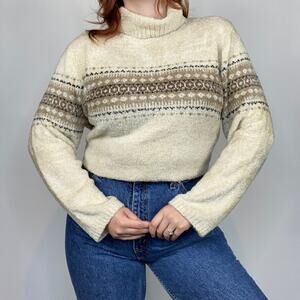 The sweater is. Neutral ivory tan color, boxy oversized fit, Nordic theme striped pattern, soft cozy blanket like material, cowl neck sweater.