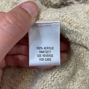 The sweater is. Neutral ivory tan color, boxy oversized fit, Nordic theme striped pattern, soft cozy blanket like material, cowl neck sweater.