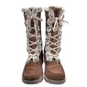 Elevate your boot game with these vintage Skechers boots. Featuring a brown suede lace up design, these boots are perfect for women who want to add a touch of flair to their wardrobe.