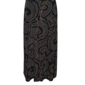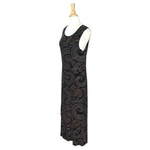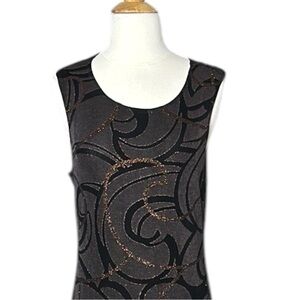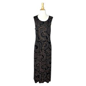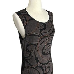 Gorgeous, slinky, figure hugging, stretchy long sleeveless dress. It is Y2K era and features a scoopneck, pullover style, and has a funky, black and metallic bronze all over Swirl pattern.