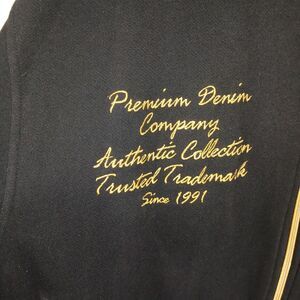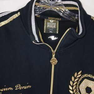 This is a pre-owned vintage Y2K early 2000s and 90s hip-hop Southpole track jacket in a size men's XL. It features a striking black and gold color scheme with embroidered details on the chest and a full front zipper. The jacket has a high-collar design and white and gold stripes on the sleeves and cuffs, giving it a classic athletic and streetwear vibe. The "Southpole Premium Denim Company" and "Authentic Collection" spellouts are embroidered on the left chest, with a large, elaborate embroidered crest on the right. This jacket is a perfect representation of early 2000s and 90s hip-hop fashion.