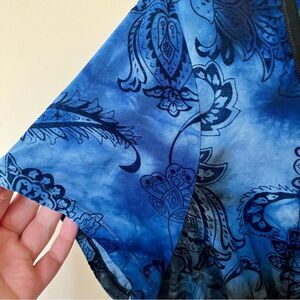Double layered mesh material with a blue and gray tie dye pattern, with a burnout velvet paisley print overlay. Square neckline piled with black satin material. Ruching on torso creates a corset like effect. Stretchy and comfortable!