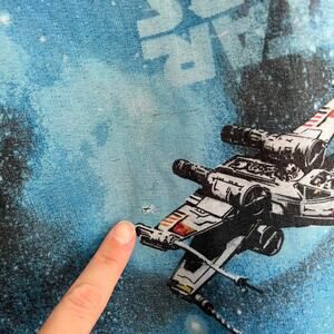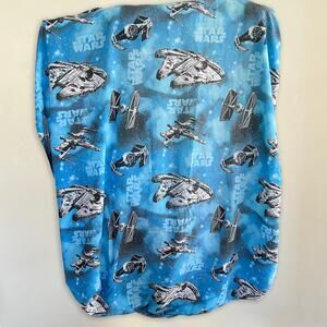 Vintage Star Wars twin fitted sheet. The print includes the Millennium Falcon, X-wing Starfighter, TIE Fighter, and Darth Vader's TIE Fighter. Cotton/poly blend with elastic corners. I estimate these to be from the early 2000s when the prequel trilogy was released (1999-2005) based on the label. In GUC with a tiny hole in the center and some pulling to corner seams to be picky. See photos.