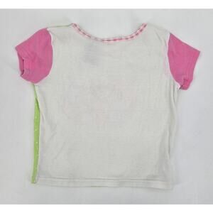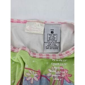 Sweet dreams meet Y2K nostalgia with this adorable Strawberry Shortcake pajama set! The top features a vibrant lime green body, pink sleeves, and glittery “Twirly Girly” graphic, paired with floral critter print pants. A rare and collectible piece for fans of early 2000s character wear.