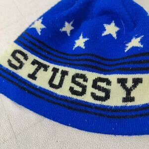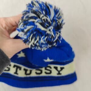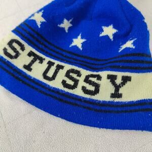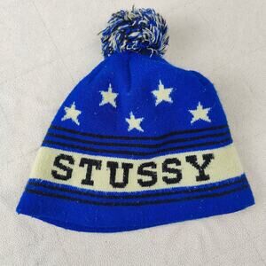 Vintage Y2K Stussy Beanie Adults One Size Blue Knit Star Intarsia Pom Pom Vtg