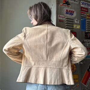Vintage Y2K Bandolino genuine suede jacket in a neutral khaki tan with wine-toned floral and vine embroidery along the neckline. Single-breasted design with a V-neck front and hook-and-eye closures down the center.