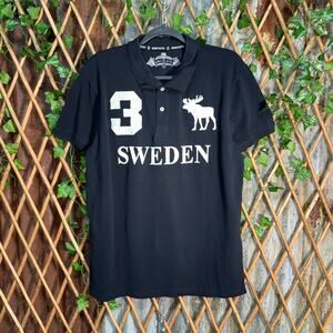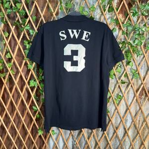 Vintage / Y2K Sweden, Moose # 3 embroidered logo spell out front and back head double sided multiple graphic on Robin Ruth Tag black polo quarter button T-shirt, Chief Keef polo style grunge, Mallgoth hip-hop, swag essential