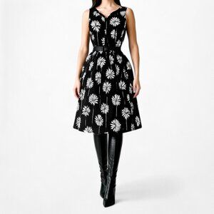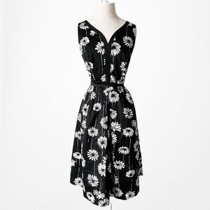 Vintage Y2K Talbots Black White Floral Knee Length Pleated Skater Dress Size M