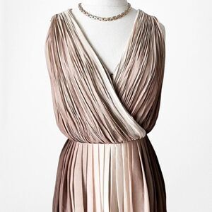 Brown sleeveless cocktail flared knee length dress featuring a V-Neck and pleated details. Zips up on the side. Fully lined. Belt not included; only used for styling. Pre-loved. Excellent. Like new. No visible stains or tears