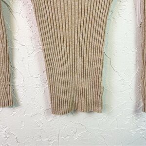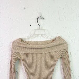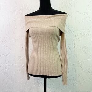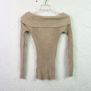Vintage Y2K Tan Beige Ribbed Stretchy Off The Shoulder Sweater Knit Top Small