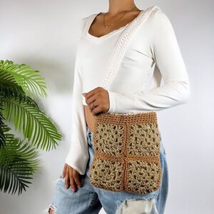 Vintage Y2K Tan Crochet Cottagecore Shoulder Bag Knit Boho Coastal Grandma Purse