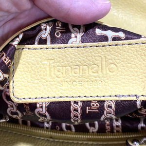 Vintage Y2K Tignanello shoulder bag purse in solid mustard yellow leather and silver tone hardware. Zipper closure at the top plus lots of exterior and interior zipper pockets including a wallet style front pocket. The leather strap is adjustable - the lining is a silky polyester satin fabric in the classic Tignanello brand chain pattern. The silvertone hardware carries the brand logo. There is light overall wear on this bag but the leather is soft and undamaged and the interior is clean and fresh - overall excellent vintage condition and ready to carry!
