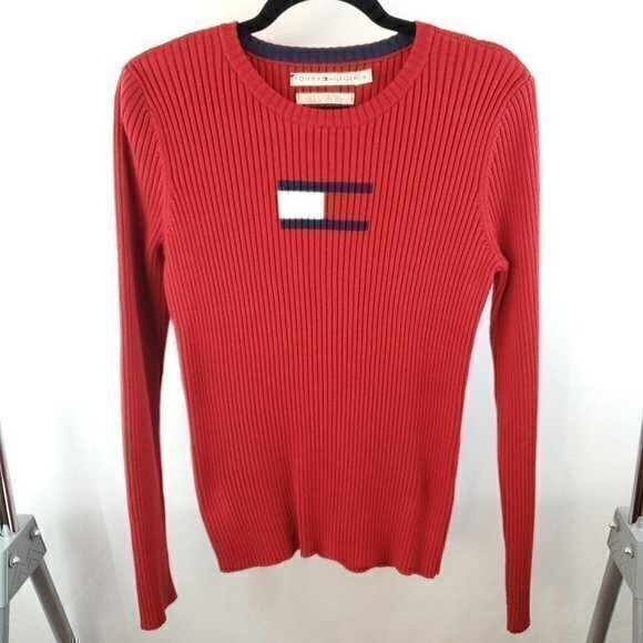 Vintage Y2K Tommy Hilfiger Logo Red Ribbed Long Sleeve 100% Cotton Sweat…