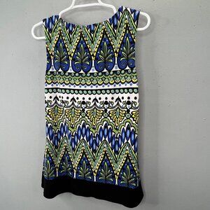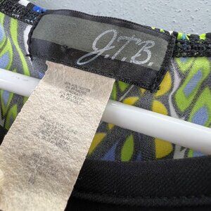 Vintage JTB pullover top in shades of green, blue, white and black. Sleeveless, keyhole neck, stretchy, good condition. Y2K, Boho, Artsy, Paisley. Size M.