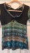 Great vintage condition. Estimated women’s small-medium. Approximate measurements: 14 1/2" pit to pit. 21 1/2" shoulder to hem. No brand or size tag. Stylish and unique women's top featuring a black sweater fabric on top with a cute velvet bow and a vibrant black, blue, brown and orange design on the bottom and on the sleeves. V neck features a black velvet trim. Silver sequins add a touch of sophistication. 95% Polyamide Nylon. 5% Elastane. Made in Italy. Stretchy, multicolored, colorful, early 2000s, 90s, flattering, sexy, funky, fall, winter, statement, fun, breathable, lightweight, Euro, European, going out, club, pop of color.