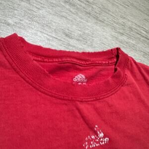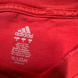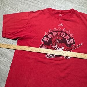 This product is a vintage Y2K Toronto Raptors Adidas shirt in size M. The shirt features short sleeves, a crew neck, and is made of cotton with a red color. It is machine washable and has a regular fit. The shirt is adorned with logos, representing the brand Adidas and the iconic players Vince Carter and Tracy McGrady. This retro shirt is perfect for fans of 90s basketball and nostalgic collectors of sports apparel.