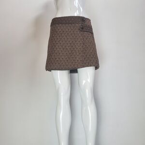 Vintage Y2K Trina Turk brown wool wrap mini skirt. Low-rise with 3 button wrap closure and inner lining. No pockets.