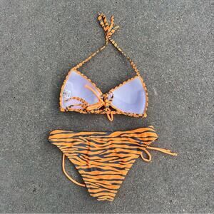 Vintage Y2K True Crush Orange Tiger Stripe Triangle Pushup Bikini Small/Medium