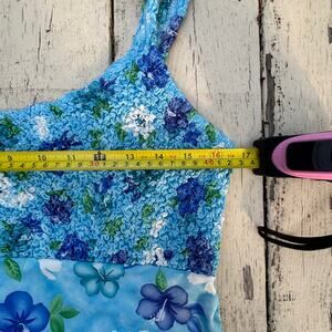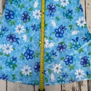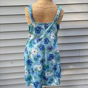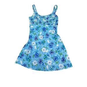 Vintage Y2K Up Front Smocked Mini Dress – Blue Floral Hibiscus Print, Size L