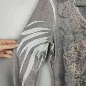 Vintage Y2K Vanity Top Womens Large Gray Distressed Thermal Fleur de Lis Bling Tattoo Biker Ed Hardy