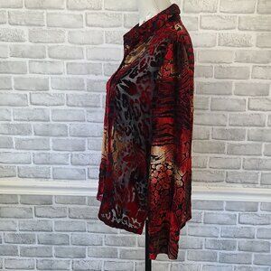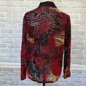 Elevate your style with this vintage Y2K velvet burnout shirt. Featuring a whimsical design, button closure, and long sleeves, this blouse is perfect for any occasion. New old stock ensures pristine condition. Ideal for those who love unique, retro fashion.