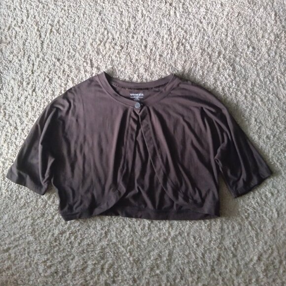 Vintage Y2K Venezia dark brown shrug/bolero which can be buttoned at the top. Polyester, rayon, spandex blend. Size 14-16. Minor pilling throughout, but otherwise in decent condition.