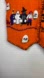 Soft blend of ramie/cotton in vibrant orange. Cute trick or treaters and haunted house designs on the front. Black whipstitch trim