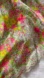 Bright floral fabric with lace detail. Features pink, green, and yellow hues. 100% polyester.