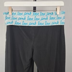 Vintage Y2K Victoria's Secret PINK bootcut yoga pants. Black with a blue foldover waistband with "love pink" in cursive lettering on the waistband. There is a very tiny pinhold near the seam on the front as pictured, but I think it could be mended. Size Medium
